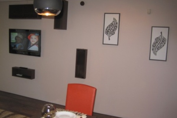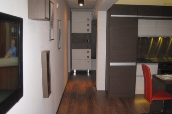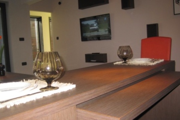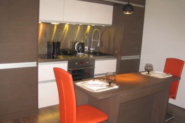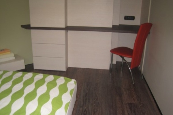 The living room, the dining room and the kitchen constitute one premise with functionally separated recreation area, dining area and cooking area. The basic equipment is built-in. The guests will have an oven, ceramic hot plates, extractor hood, fridge with a freezer, coffee maker, hot water kettle, sandwich toaster, crockery and cutlery, utensils, dishes, dishwasher, washing machine, hairdryer. The recreation area is furnished with a modern leather sofa which when extended turns into a comfortable bed.