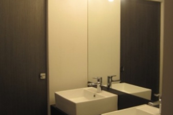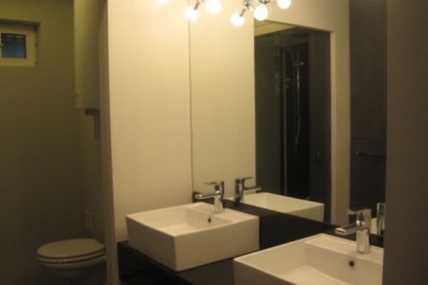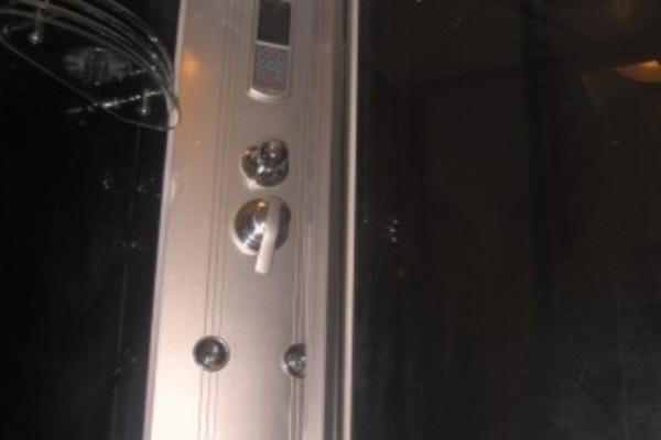 The bathroom is unique and in designer style. A sliding door separates the toilet with bidet and a built-in wall structure. The shower enclosure with glass partitions is equipped with hydro-massage shower panel and steam bath.